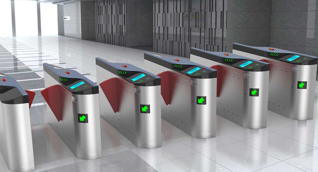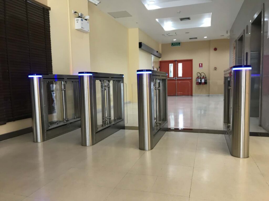 Flap barrier gate which also called as smart electronic security hidden glass gate is the type of electronic sliding gate with glass wings and motors used as smart gate when integrated with a smart access authentication system or a biometric or RFID card system. They operate automatic with a sliding wing glasses and motors. They are used as a security access gate at the buildings and offices. This help you to control, monitor, and audit the visitors, guests and employees come to the reception areas, large event venues, stadiums, passengers at the airports. Flap barrier gate is also known as smart security speed gate. Such gates are used in airport emigration e gate system which allows access with UAE emirates ID.